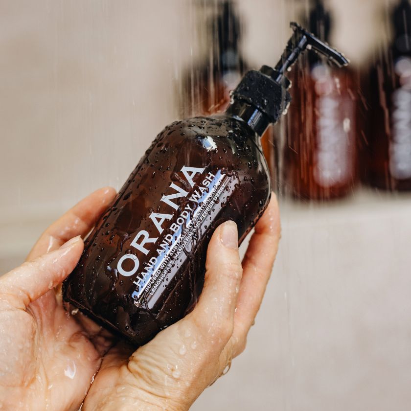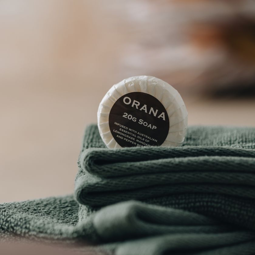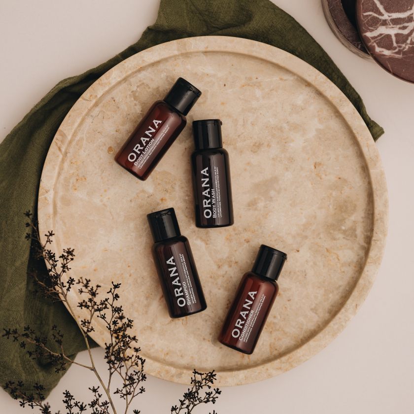 The ORANA collection is attractive yet unassuming. The warm, amber coloured bottles are topped with high gloss flip caps, meaning guests will have no problem dispensing the product. The large artwork, printed with white text, makes the products easy to read and identify.